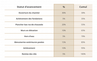 - LE FRACTIONNEMENT DU PRIX : L’acquéreur doit payer le vendeur, au fur et à mesure de la réalisation de l’ouvrage et non en attendant l’achèvement. Il est soumis à un échelonnement des paiements en fonction de l’avancement des travaux.
