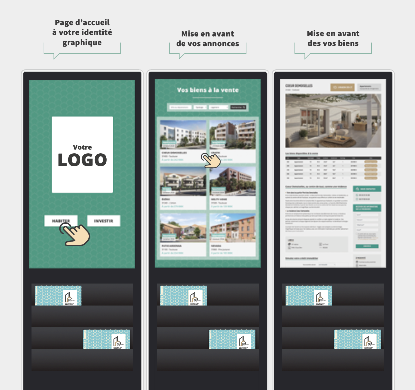 Intuitive, tactile et connectée, elle permet aux visiteurs de découvrir vos biens en toute autonomie, de visualiser plans, photos et maquettes 3D, et même de laisser leurs coordonnées.