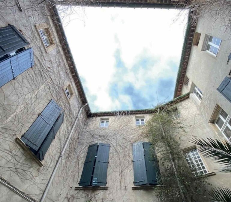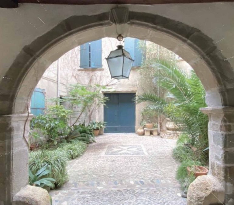 Poussez la porte du 7 rue Louis Blanc, un passage couvert plafonné à la française ouvre sur une cour intérieure ombragée avec son jardin intimiste et préservé. Une remarquable calade, faite de pavés en galets roulés et ornée d’une Croix de Malte décore ce patio.