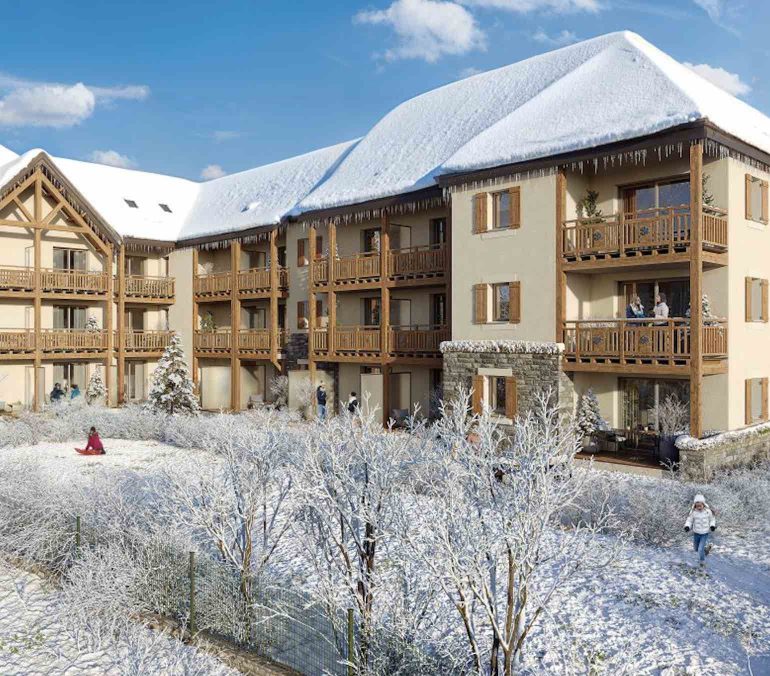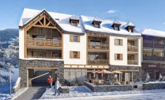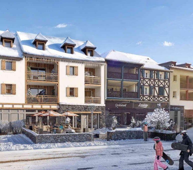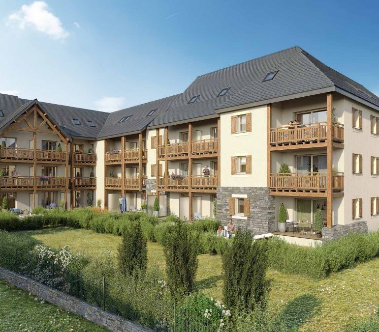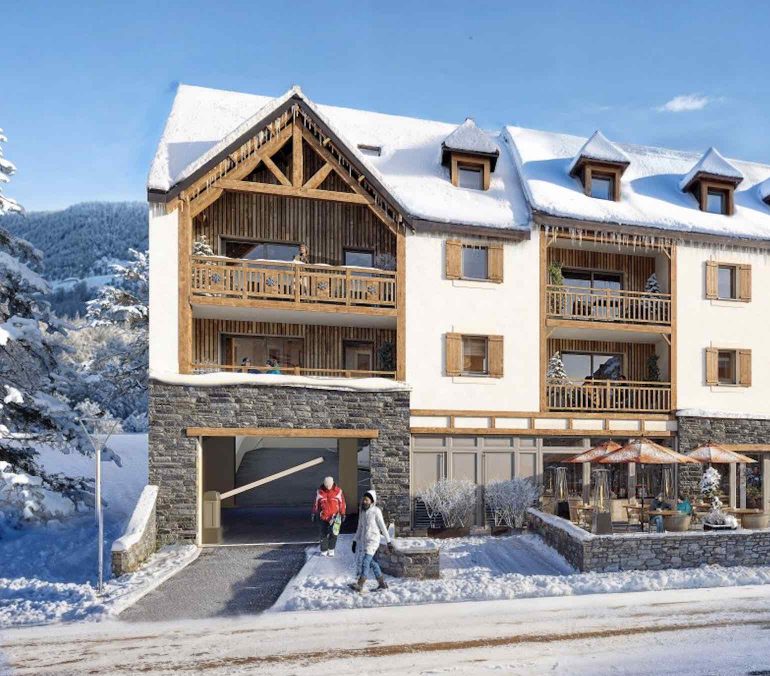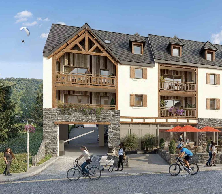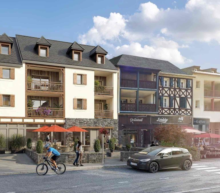 Les façades en enduit de teinte claire, ponctuées de parements pierre et de balcons en bois, s’harmonisent avec une toiture en ardoise à pans multiples, rappelant les codes architecturaux des vallées pyrénéennes. La résidence propose 36 appartements de standing, du studio au 3 pièces duplex et accueillera un commerce en rez-de-chaussée.