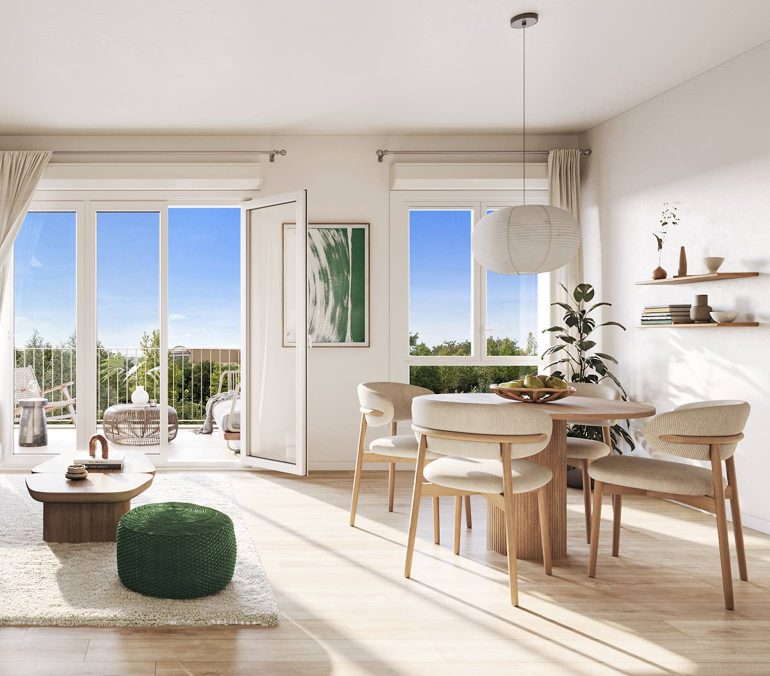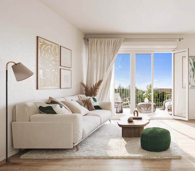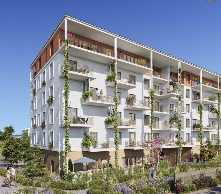 L’architecture fait la part belle aux balcons, aux loggias, ainsi qu’aux jardins privatifs, pour offrir un agréable prolongement aux appartements. Ces espaces extérieurs sont soulignés par un jeu de bandeaux et de colonnes permettant aux plantes grimpantes d’investir les façades.