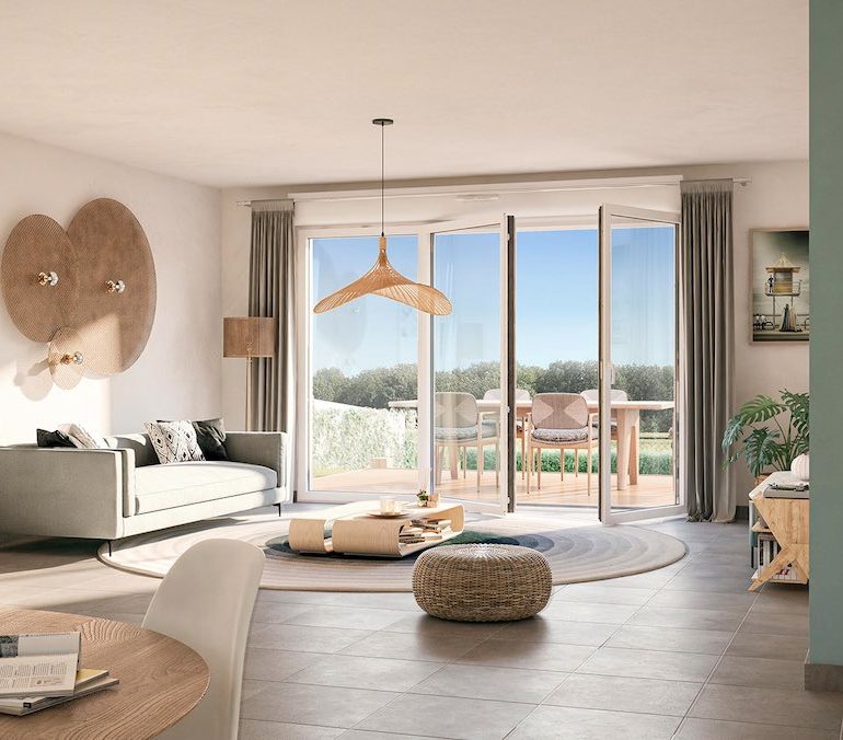 Rivéa se compose de maisons de 3 à 5 pièces et d’appartements de 2 et 3 pièces qui s’harmonisent dans une architecture contemporaine alliant matériaux nobles et finitions soignées. En façade, des bardages verticaux de bois clair alternent avec des enduits blancs épurés.